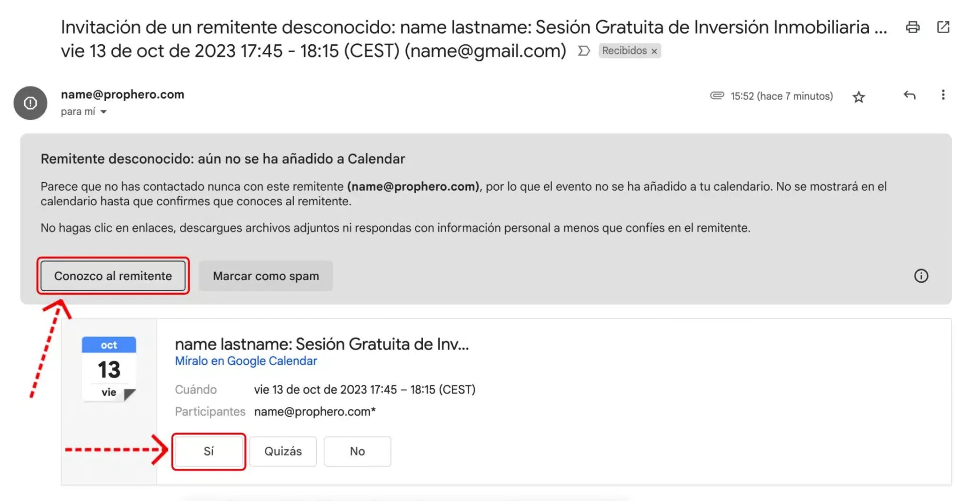 Search your inbox for ‘Real Estate Investment Session’ from a @prophero.com domain and click ‘I know the sender’ and then ‘Yes’ to accept the event invitation.